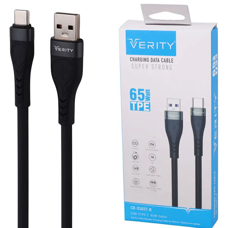 / کابل تایپ سی فست شارژ 65 وات وریتی CB-3162T-B طول 1.2 متر
